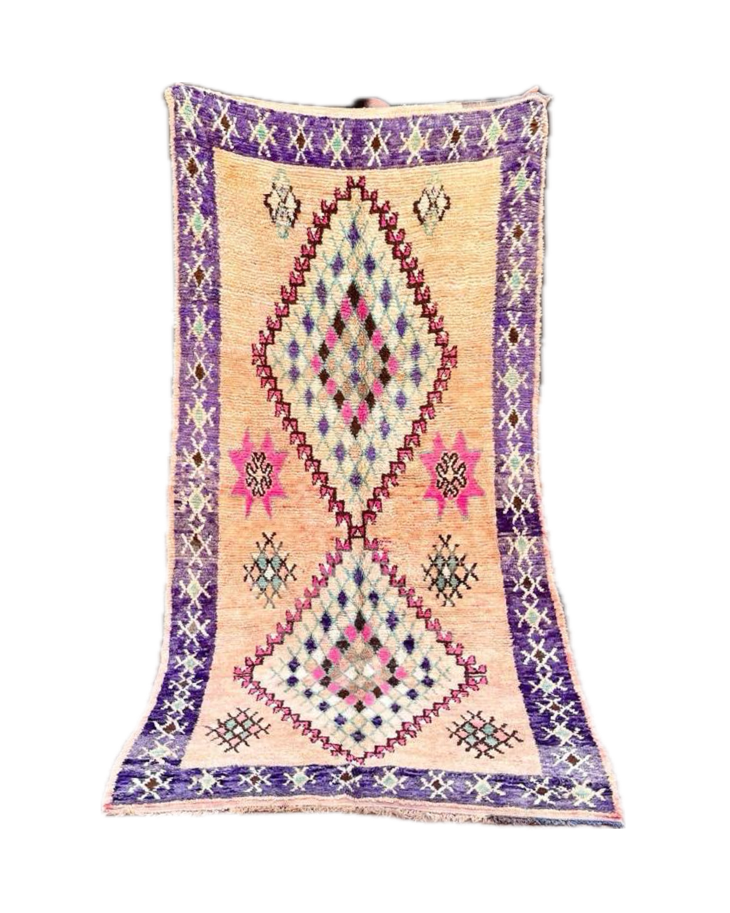 Beni Mguild handgeknoopt vloerkleed uit Marokko. De berber kleden zijn van dikke kwaliteit, een hoogpolig vloerkleed.  De Mguild kleden zijn meestal paars of rood, beige of pastel. Het maken van de Beni Mguild vloerkleden gebeurt niet meer, deze kleden zijn dus oud. Er is dus slechts één exemplaar beschikbaar. Vandaag besteld is de volgende werkdag in huis. Wij leveren het vloerkleed gratis. Op die manier kunt u het zonder risico thuis beoordelen. Niet tevreden? Stuur het kleed eenvoudig terug en u krijgt uw geld direct terug.