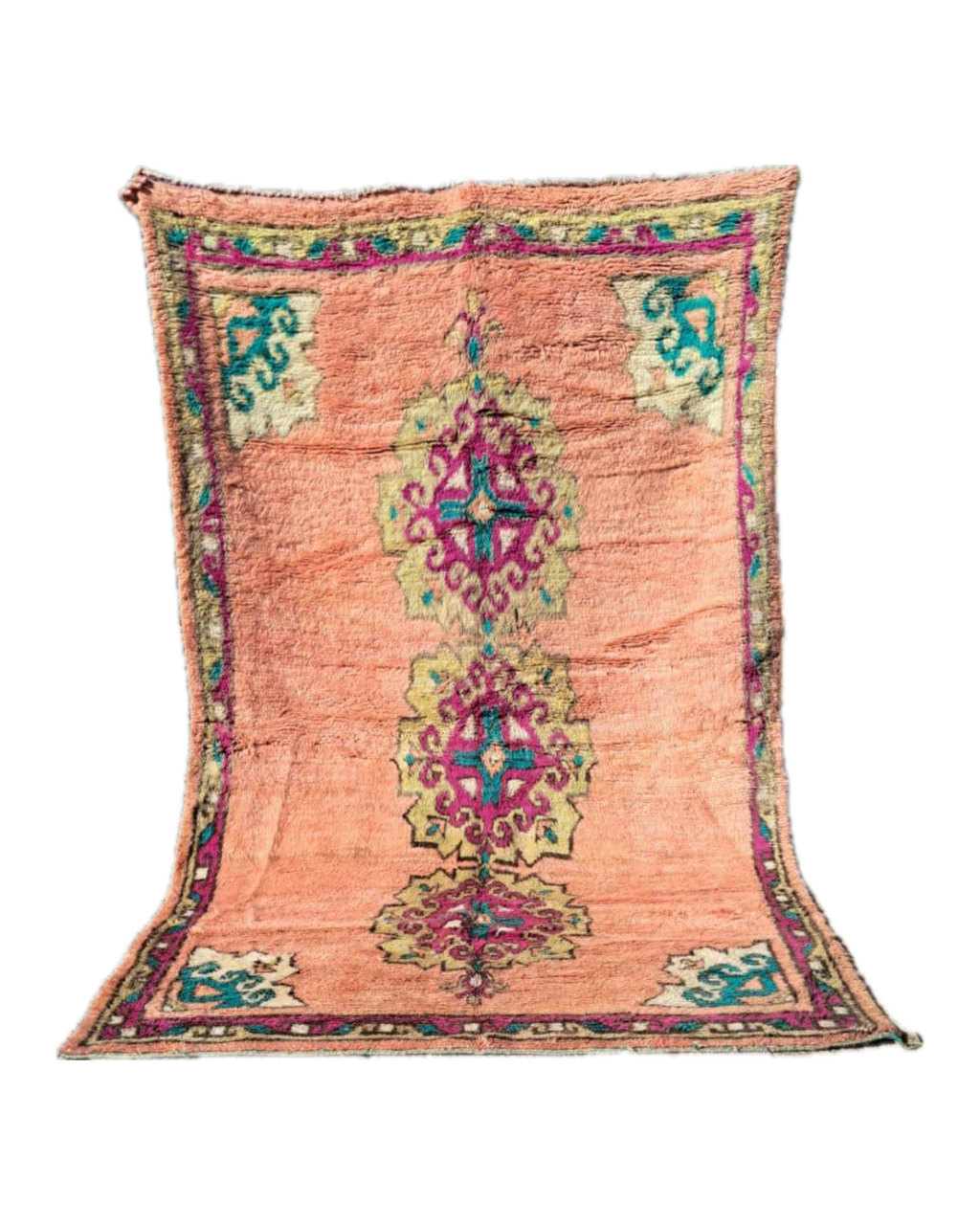 Beni Mguild handgeknoopt vloerkleed uit Marokko. De berber kleden zijn van dikke kwaliteit, een hoogpolig vloerkleed.  De Mguild kleden zijn meestal paars of rood, beige of pastel. Het maken van de Beni Mguild vloerkleden gebeurt niet meer, deze kleden zijn dus oud. Er is dus slechts één exemplaar beschikbaar. Vandaag besteld is de volgende werkdag in huis. Wij leveren het vloerkleed gratis. Op die manier kunt u het zonder risico thuis beoordelen. Niet tevreden? Stuur het kleed eenvoudig terug en u krijgt uw geld direct terug.