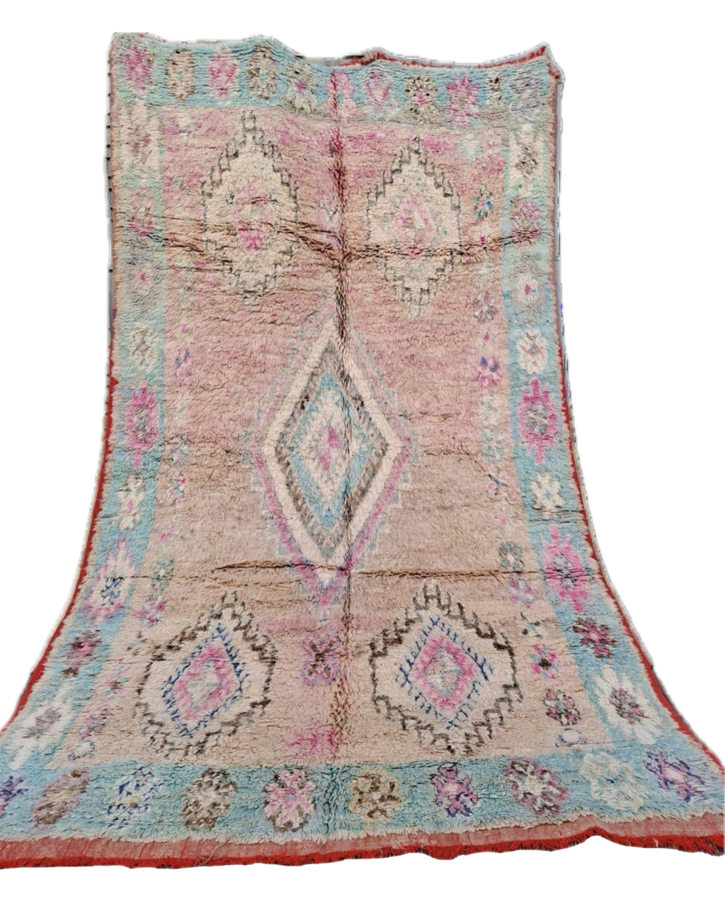 Beni Mguild handgeknoopt vloerkleed uit Marokko. De berber kleden zijn van dikke kwaliteit, een hoogpolig vloerkleed. De Mguild kleden zijn meestal paars of rood, beige of pastel. Het maken van de Beni Mguild vloerkleden gebeurt niet meer, deze kleden zijn dus oud. Er is dus slechts één exemplaar beschikbaar. Vandaag besteld is de volgende werkdag in huis. Wij leveren het vloerkleed gratis. Op die manier kunt u het zonder risico thuis beoordelen. Niet tevreden? Stuur het kleed eenvoudig terug en u krijgt uw geld direct terug.